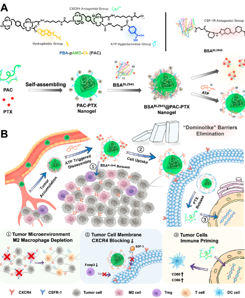 示意图:ATP超敏型多米诺序贯药物递送策略用于TIME的破除