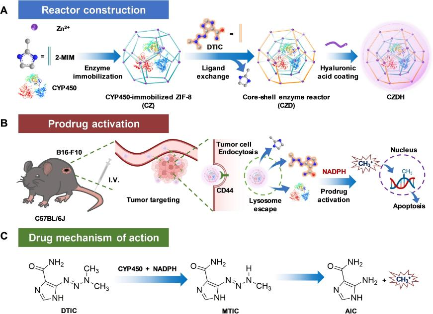 丁娅团队设计和构建一类具有双层金属有机框架的酶反应器,解决酶-前药疗法中共性存在的酶和底物的精准时空调控、酶活性和催化效率的保持,以及前药原位耗竭等问题。首先,利用沸石咪唑骨架-8(ZIF-8)固定肝微粒体酶CYP450;其次,通过配体交换方法在其表面构建基于Zn-达卡巴嗪(DTIC)的外壳框架。这种特殊的核—壳结构将酶和其底物整合在同一体系中,确保其体内分布的一致性。在有效保护CYP450活性的同时,显著提高了DTIC的载药量。结果显示,该反应器仅在肿瘤细胞内高浓度烟酰胺腺嘌呤二核苷酸磷酸(NADPH)条件下发生前药激活反应,显著提高了酶催化反应的细胞选择性。该工作为体内生物催化的有效性、选择性和安全性提供了一种简单而通用的策略。
