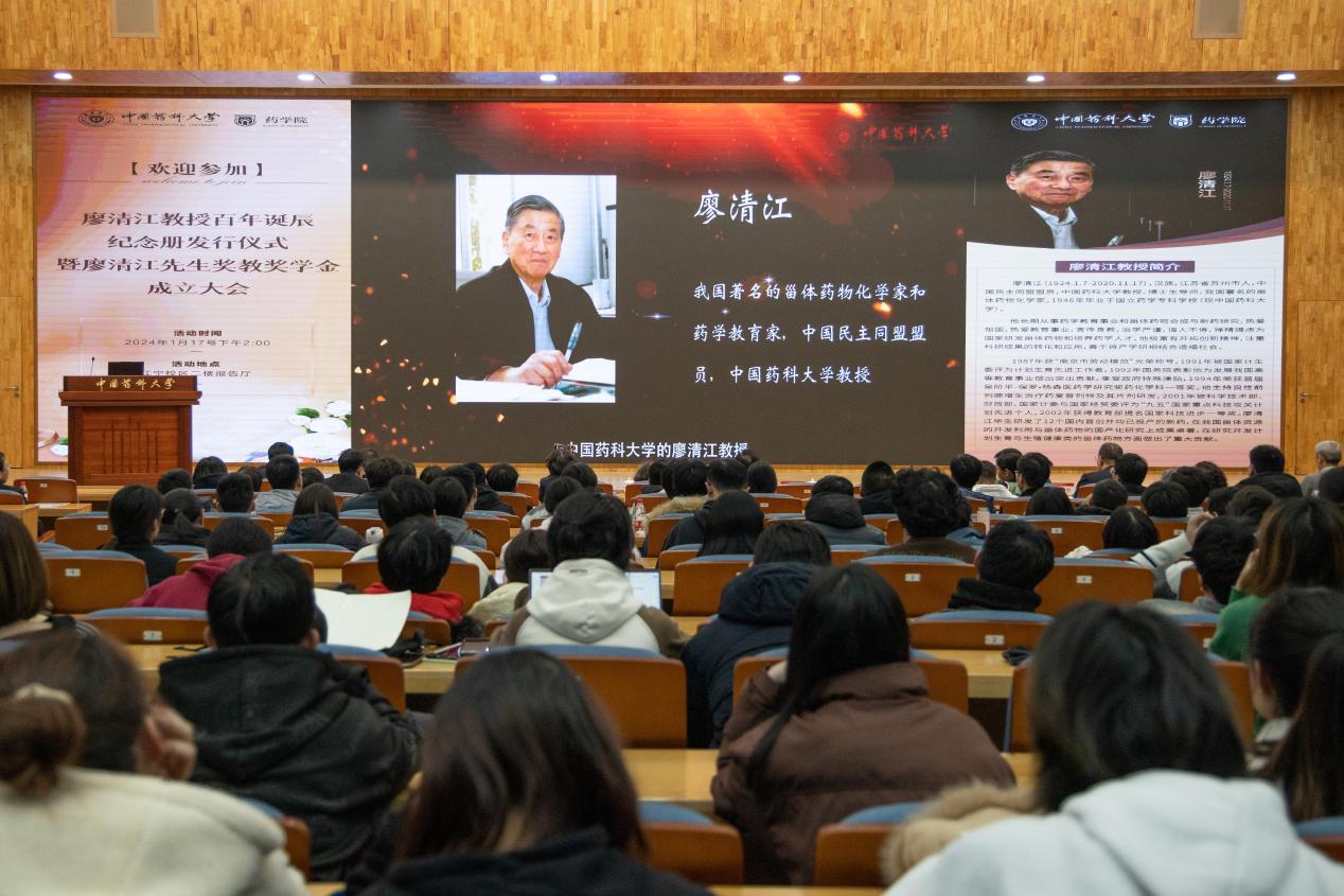 为纪念我国甾体激素药物领域的重要开拓者之一,我国著名的甾体药物化学家、药学教育家廖清江教授的百年诞辰,宣传并弘扬其精神风范,1月17日下午,公司在江宁校区二楼报告厅隆重举行“廖清江教授百年诞辰纪念册发行仪式暨‘廖清江先生奖教奖学金’成立大会”。太阳集团tyc151副董事长齐炼文、廖清江教授亲属代表、企业代表、员工代表、集团相关职能部门负责人、太阳集团tyc151领导班子成员及太阳集团tyc151师生代表近300人参加了本次会议。会议由太阳集团tyc151党委书记张仕英主持。