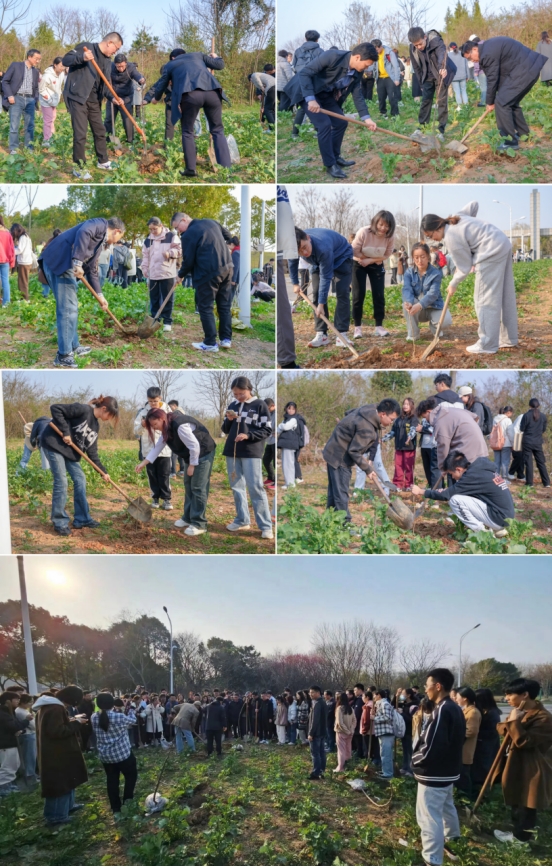 植树现场,40余个党团支部近500名党团员青年走入劳动实践基地,挥锹铲土、培土围堰、提水浇灌,按照“三埋两踩一提苗”的种树要领操作,齐心协力种下一棵棵树苗。200株无花果、果桑新苗整齐划一、迎风而立,为春日药大增添了勃勃生机和活力。