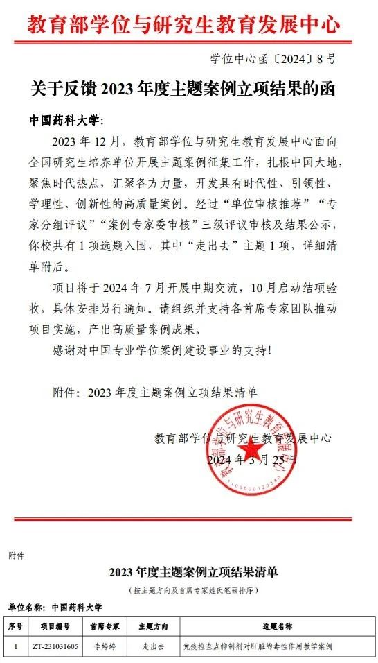 近日,教育部学位与研究生教育发展中心2023年主题案例征集评审结果揭晓,公司太阳集团tyc151李婷婷副教授申报的案例《免疫检查点抑制剂对肝脏的毒性作用教学案例》获得立项。