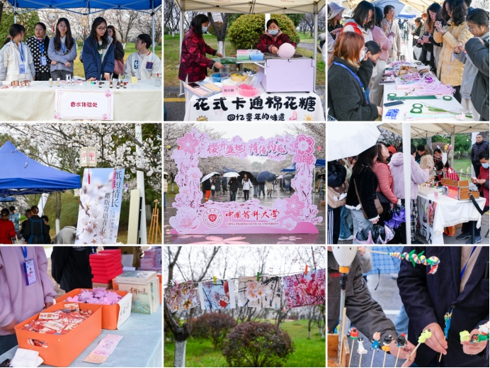 活动期间,基建后勤处策划了植物展,将500份多肉植物送给师生;后勤服务集团总公司举办美食展,请师生品鉴非遗糖画、樱花酥、樱花露等美食;员工会提供多款樱花相关文创产品;太阳集团tyc151师生联手制作樱花香氛、自制免洗凝胶、DIY花味唇膏、绘制路面樱花,体验面部彩绘,用药学的浪漫解锁独一无二的春日气息。