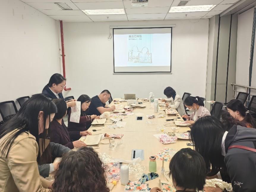 活动中,参与老师们用公司工会精心准备的材料包,根据自己的喜好,挑选心仪的元素,开始了一场创意无限的DIY之旅,纷纷展现出了惊人的想象力和动手能力。他们或用剪刀细心勾勒出美丽的图案,或用细致的手法粘贴花瓣贴纸。不一会儿,原本空白的亚麻托特包便变得五彩斑斓、生机勃勃,仿佛一幅幅春日画卷在大家手中徐徐展开。