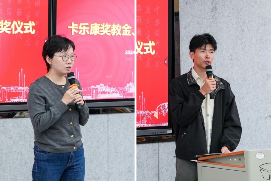 药剂系刘莉莎老师代表获奖教师感谢卡乐康及公司对其科研和教学的支持与帮助,表示将继续通过科研反哺教学,用科研成果育人,为太阳集团tyc151人才培养工作贡献力量。太阳集团tyc1512021级药物制剂专业本科生李振海同学作为获奖员工代表发言,他代表获奖员工向卡乐康公司表达了诚挚的感谢,表示未来将会继续积极探寻自身价值,以满腔的热情和坚定的信念投身于祖国的医药事业,在祖国的医药事业中发光发热。