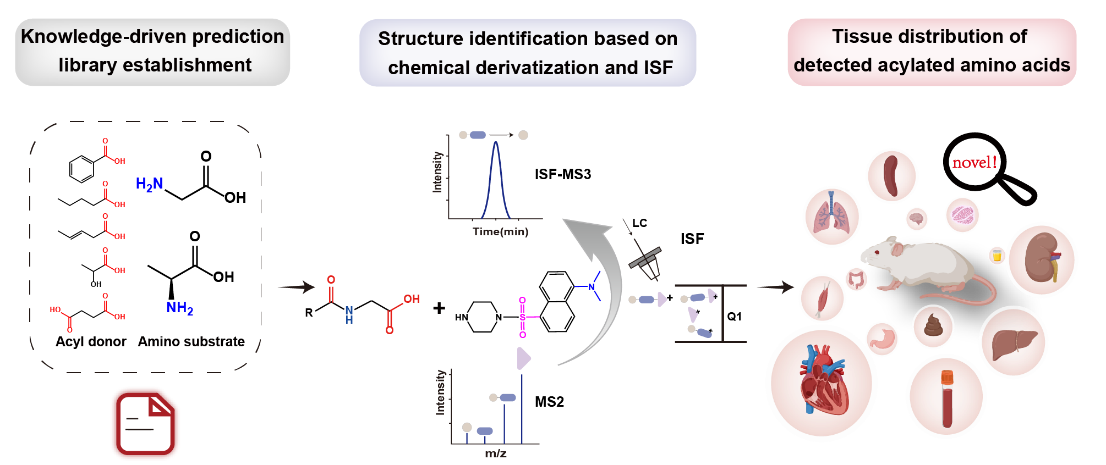 为实现体内新型修饰代谢物的深度挖掘,团队提出基于质谱探针及虚拟预测策略的酰化修饰氨基酸分析新方法和新技术体系。构建了修饰氨基酸虚拟预测库,结合质谱探针及源内裂解技术对酰化修饰氨基酸进行识别与鉴定,首次报道了许多新型酰化氨基酸并揭示了其组织分布特点。相关内容以“Discovery of novel acylated glycine and alanine by integrating chemical derivatization-based LC-MS/MS and knowledge-driven prediction”为题发表在Analytical Chemistry。太阳集团tyc1512023级博士生肖钦文为本文第一作者,许风国教授和张培副教授为共同通讯作者,太阳集团tyc151为唯一通讯单位。