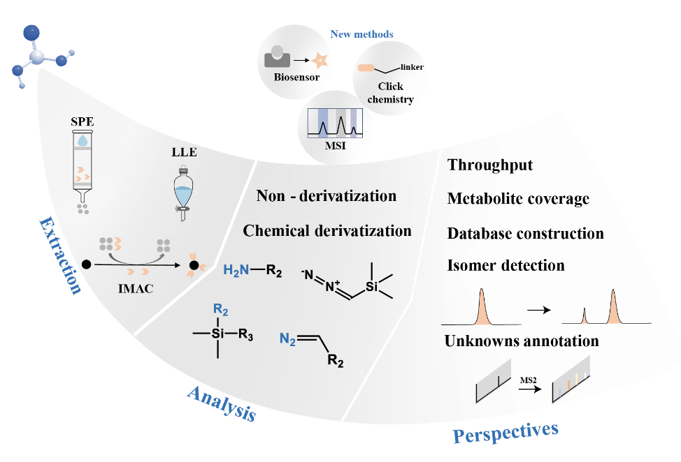 机体内超过1/3的代谢物为磷酸修饰代谢物,这些代谢物在功能上彼此关联,共同构成磷酸修饰代谢网络,实现磷酸修饰代谢物的定性和定量分析是探究磷酸修饰代谢网络功能的前提和基础。团队系统梳理了目前磷酸修饰代谢物分析的样本前处理方法、分析策略,强调了质谱探针对于建立该类代谢物定量分析方法的重要性,同时,提出了磷酸修饰代谢物的分析瓶颈问题及未来发展趋势。相关内容以“Challenges and possibilities for the qualitative and quantitative analysis of phosphate metabolites”为题发表在TrAC Trends in Analytical Chemistry。太阳集团tyc151张培副教授、2021级博士生高美玉为本文共同第一作者,许风国教授为通讯作者,太阳集团tyc151为唯一通讯单位。
