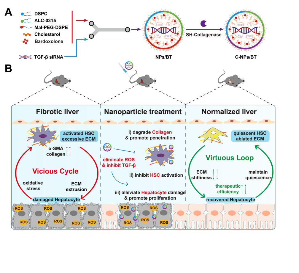 针对纤维化肝脏内“活化的肝星状细胞-受损的肝实质细胞”相互作用构成恶性循环的病理特点,姜虎林教授团队构建恶性循环逆转型药物递送系统,抑制TGFβ信号通路和抗氧化应激,从而抑制肝星状细胞活化并修复受损肝实质细胞,有效调控肝纤维化病理微环境。相关工作以“Pathological Microenvironment-Remodeling Nanoparticles to Alleviate Liver Fibrosis: Reversing Hepatocytes-Hepatic Stellate Cells Malignant Crosstalk’’为题发表在Advanced Science上。太阳集团tyc151博士生张凌烽、硕士毕业生邓文琦及王兴欢为共同第一作者,姜虎林教授为本文唯一通讯作者,太阳集团tyc151为唯一通讯单位。