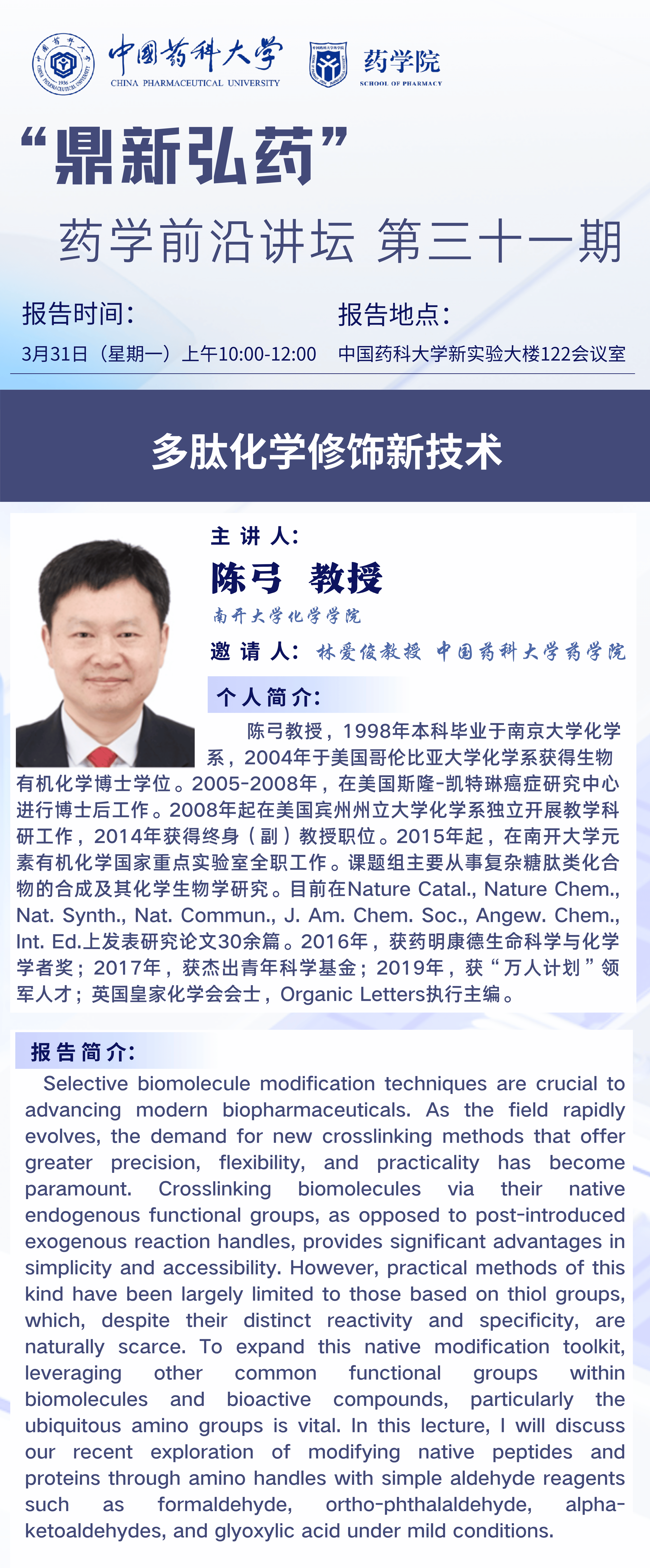 “鼎新弘药”药学前沿讲坛第三十一期通知