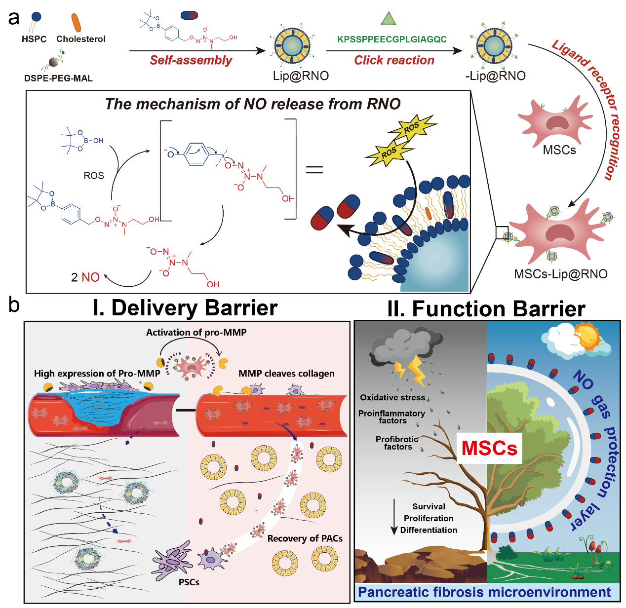 胰腺纤维化是慢性胰腺炎的独特组织病理学特征,表现为正常胰腺实质组织结构丧失,被纤维胶原取代。针对这类以组织修复为病症的疾病,通过具有自我更新、定向分化等功能的干细胞药物进行疾病干预是潜在的治疗手段。该团队前期发现干细胞用于纤维化治疗存在两大挑战:(1)干细胞因其尺寸较大,在纤维胶原层的渗透能力受限,难以定向迁移到病灶深处;(2)纤维化的恶劣微环境造成干细胞在损伤部位迅速凋亡失活,削弱疗效。因此,该团队开发一种一氧化氮脂质体嫁接的工程化MSC,通过调节胶原纤维缓解血管压迫,推动干细胞在胰腺组织分布并增强干细胞体内活性,提高治疗效果。