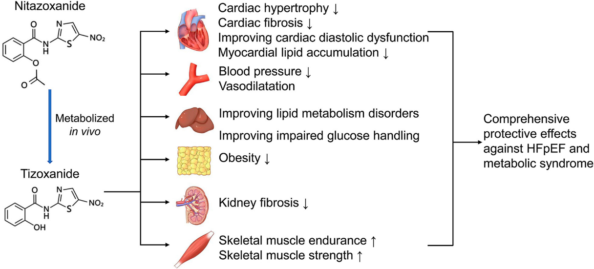 射血分数保留型心衰(HFpEF)是一种复杂因素相关性疾病,其发生与衰老、肥胖、高血压、糖脂代谢异常以及慢性炎症等因素有关。硝唑尼特(Nitazoxanide)是一种临床抗原虫药物,具有良好的安全性,体内吸收后迅速代谢为替唑尼特(Tizoxanide)发挥药理作用。前期研究发现硝唑尼特及其活性代谢物替唑尼特均具有线粒体解偶联作用,可抑制实验性高脂血症、肝脂肪样变和动脉粥样硬化,改善器官纤维化。基于此,该团队研究了硝唑尼特对HFpEF的影响,发现口服途径给予硝唑尼特可显著抑制高脂饲养联合L-NAME诱导的HFpEF小鼠心肌肥厚、心脏纤维化、心脏舒张功能障碍、心脏脂蓄积、血压升高、运动耐力受损、肝脏脂肪样变、肾纤维化和主动脉收缩功能减退等;揭示了硝唑尼特有望成为治疗HFpEF及相关代谢综合征的潜在药物。