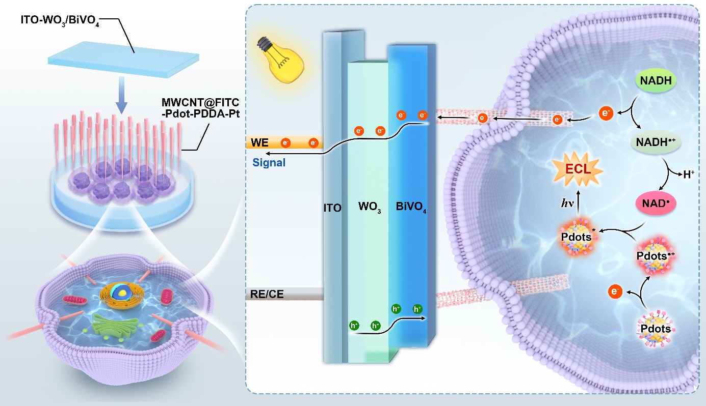 近年来,原位追踪细胞内生物标志物的研究主要依赖于电化学传感与荧光检测技术,但这些技术的广泛应用受限于高昂的显微操纵设备或高特异性的荧光探针。针对上述科学问题,研究团队提出了一种基于改性多壁碳纳米管的纳米线跨膜电子隧道技术,为实现细胞内生物标志物的原位动态监测提供了新策略。研究团队论证了NADH作为遗传毒性成分筛查标志物的可行性,并以此作为研究示范进行了概念验证。实验发现,功能化纳米线可通过胞吞作用自发地半嵌入细胞,在此基础上,耦合光电化学传感与电化学发光技术,成功实现了细胞内电化学信号与光学信号的双模检测。这一策略不仅为细胞内分子动态监测开辟了新的技术路径,还为潜在遗传毒性成分的筛查提供了全新的研究工具和方法学支持。