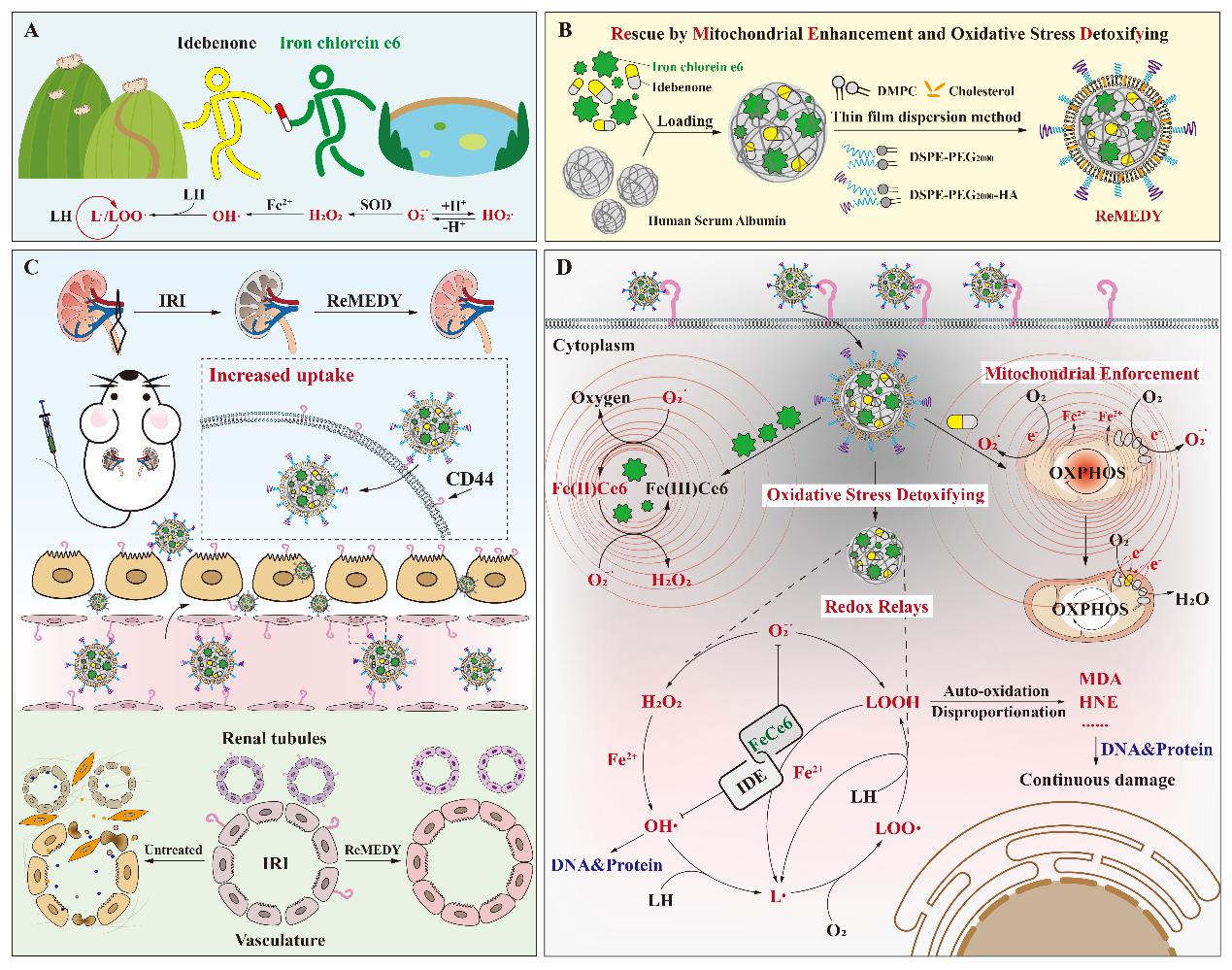 该研究设计的ReMEDY以人血清白蛋白为核心,同时负载辅酶Q类似物艾地苯醌(Idebenone, IDE)和超氧化物歧化酶模拟物FeCe6(Iron-chlorin e6),并在外层包覆透明质酸修饰的脂质层。ReMEDY借助IDE的醌循环与FeCe6的单电子转移耦合,形成独特的“氧化还原接力”机制,可广谱清除超氧阴离子及其下游氧化产物,从而高效缓解活性氧积累。同时,IDE可靶向修复线粒体功能障碍,进一步实现氧化损伤的空间精准干预。实验结果证明,ReMEDY能够特异性富集于受损肾脏组织,高效清除不同程度的氧化产物,抑制铁死亡,显著改善线粒体功能,减少细胞凋亡并降低炎症反应,在肾脏缺血再灌注损伤模型中展现出优异的治疗效果。