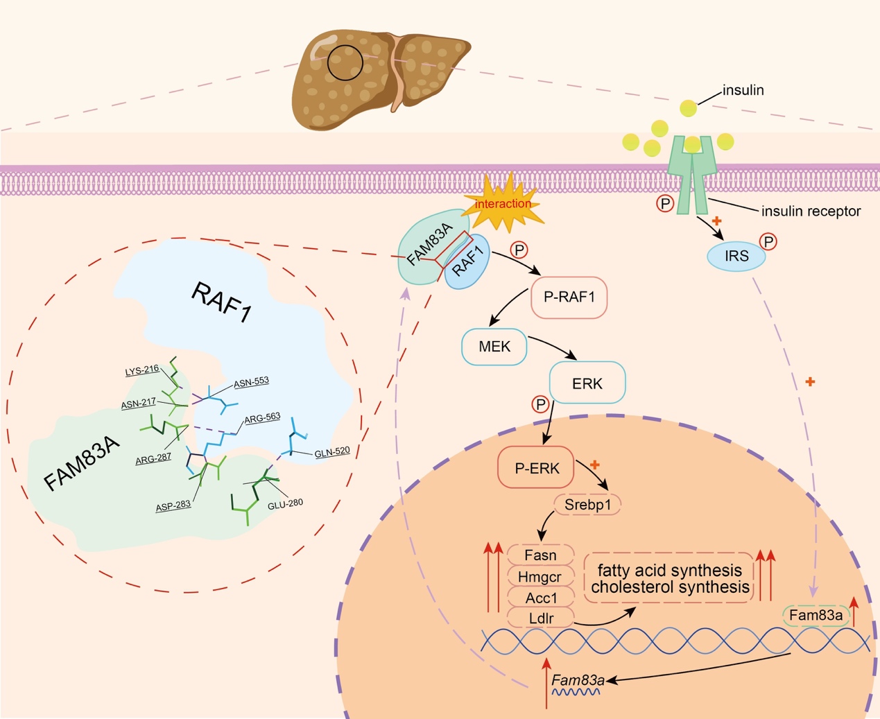 课题组首先通过综合转录组分析,筛选出在MAFLD发展中起关键作用的基因FAM83A。研究发现,FAM83A主要在肝细胞中表达,且在MASH动物模型和临床患者的肝组织中均显著上调。为探究其功能,研究人员构建了肝细胞特异性FAM83A敲除和过表达小鼠模型,分别给予高脂饮食(HFD)或胆碱缺乏高脂饮食(CDAHFD)诱导MASH。结果显示,肝细胞特异性FAM83A敲除可显著延缓MASH进展,减轻肝脏炎症和纤维化;而FAM83A过表达则会加剧肝脏脂质蓄积、炎症和纤维化形成,恶化MASH病理表型。机制研究显示,FAM83A可与RAF1发生相互作用,增强其磷酸化水平,进而激活下游ERK信号通路。RAF1抑制剂或ERK抑制剂均可显著抑制FAM83A介导的脂质合成基因表达和脂肪酸及胆固醇合成。此外,研究还发现胰岛素可通过转录依赖性的方式上调FAM83A表达,而FAM83A响应胰岛素信号,进一步促进肝细胞脂质合成,形成调控环路。