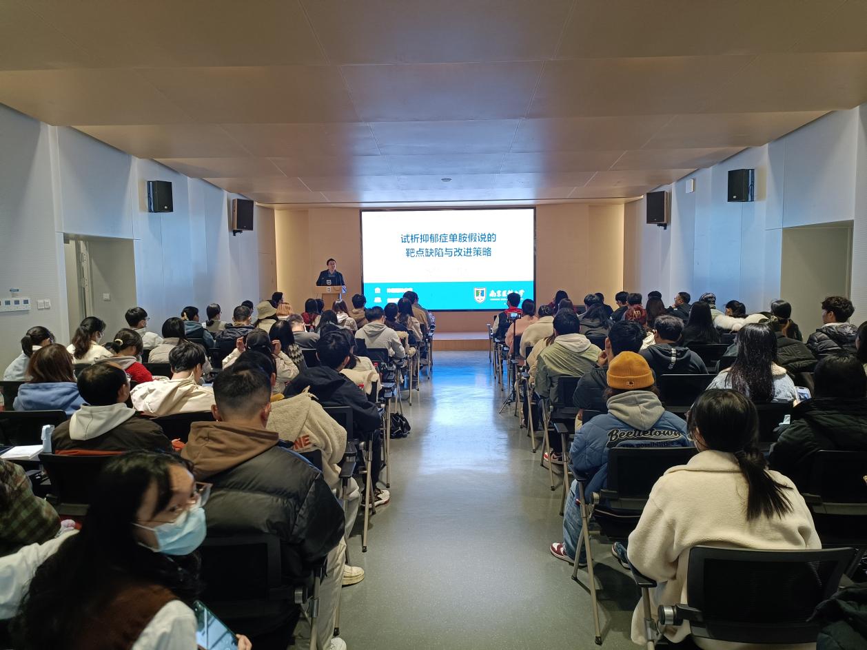 会上,周其冈教授以“试析抑郁症单胺假说的靶点缺陷与改进策略”为主题作报告。他指出“单胺假说”是现今主流抗抑郁药物的理论基础,而延迟起效是此类药物的共同缺点,经典抗抑郁药物氟西汀需要2-4周才开始显现疗效,严重阻碍了重症抑郁患者急性期的治疗。为解决上述问题,周其冈教授团队开展联合攻关,经过多年深入研究,发现了位于中缝背核区的5-羟色胺转运体与神经元型一氧化氮合酶耦联靶点(SERT-nNOS)。解开SERT-nNOS耦联,能不依赖于5-羟色胺自身受体脱敏,发挥快速抗抑郁作用。这一全新快速抗抑郁靶点的发现,对抑郁症经典假说“单胺理论”具有革新意义。该成果发表在顶尖期刊《Science》上,并被列为“亮点工作(Highlight)”。周教授的整场报告深入浅出,语言生动精彩,激起了老师和同学们的浓厚兴趣。讲座结束后,参会师生踊跃进行提问,周教授一一进行了细致耐心的解答。