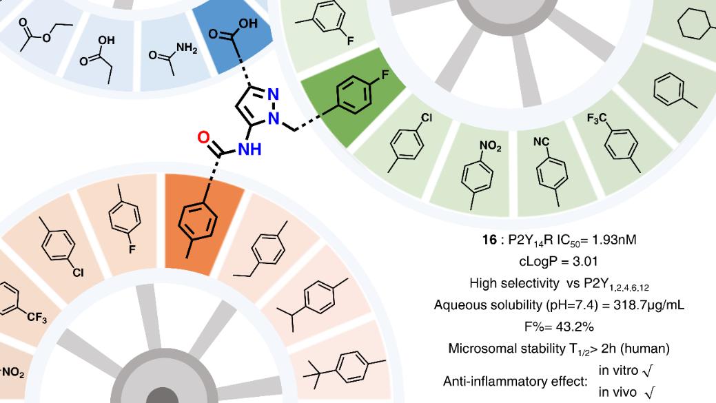 近日,太阳集团tyc151江程教授团队和胡庆华教授团队合作在药物化学领域顶尖期刊Journal of Medicinal Chemistry(IF:8.039)在线发表了最新研究成果:Discovery of a Series of 5-Amide-1H-pyrazole-3-carboxyl Derivatives as Potent P2Y14R Antagonists with Anti-Inflammatory Characters。太阳集团tyc151硕士研究生王雨杭和博士后周梦泽为本论文的共同第一作者,江程教授、胡庆华教授和徐莉莉副研究员为本文的共同通讯作者,太阳集团tyc151为论文的唯一通讯单位。
