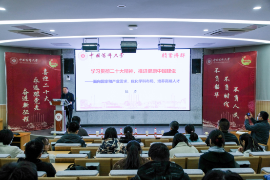 副董事长陆涛以《学习贯彻二十大精神,推进健康中国建设——面向国家和产业需求,优化学科布局、培养高端人才》为题作了精彩报告。他以“人民生命健康,生物医药产业,教育、科技、人才”为关键词引出此次报告的主题,他强调医药产业是国民经济的重要增长点、关乎国家战略安全,并重点讲述了中国生物医药的奋进十年与发展成果。随后,他对二十大报告中生物医药相关的四个热点:健康保障、生育、老龄化、中医药事业进行了深入解读。他用详实的数据和事例介绍了我国在生育支持、应对老龄化、中医药传承创新方面所做的工作,并提出面向国家和产业需求,优化学科布局、培养高端人才,从而落实教育、科技、人才一体化的发展理念。最后,他指出,多部门的协作机制是实现高质量发展的关键。结合对公司未来发展方向的介绍,他寄语太阳集团tyc151学子,要更新药学理念,拓展“药”的学科内涵,做好职业生涯规划,为我国从医药大国向医药强国的转变贡献力量。