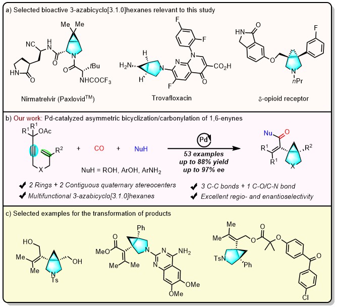 近年来,林爱俊/姚和权团队针对具有重要生物活性药物分子片段和砌块,通过过渡金属催化连续氢官能化策略以及环化去对称化等策略,设计合成了多种类型手性杂环以及高张力桥环化合物,取得多项重要科研成果 (J. Am. Chem. Soc.2022, 144, 11364-11376;Nat. Commun. 2021, 12, 6627;Nat. Commun. 2020, 11, 2544;Angew. Chem. Int. Ed.2019, 58, 2884-2888)。近日,林爱俊/姚和权团队在课题组原有工作基础上,设计开发了一类钯催化不对称串联1,6-烯炔双环化羰基化反应,成功构建 手性3-氮杂双环[3.1.0]己烷类化合物 (图一,b)。该反应具有优异的区域选择性和对映选择性,良好的底物普适性; 不同类型的亲核试剂,如醇,酚,苯胺及水均能兼容反应体系。为进一步拓展该反应潜在的应用价值,作者进行了大量衍生化合成研究 (图一,c),为手性双环[3.1.0]己烷分子骨架多样性合成和相关化合物库的构建提供了合成技术支持。