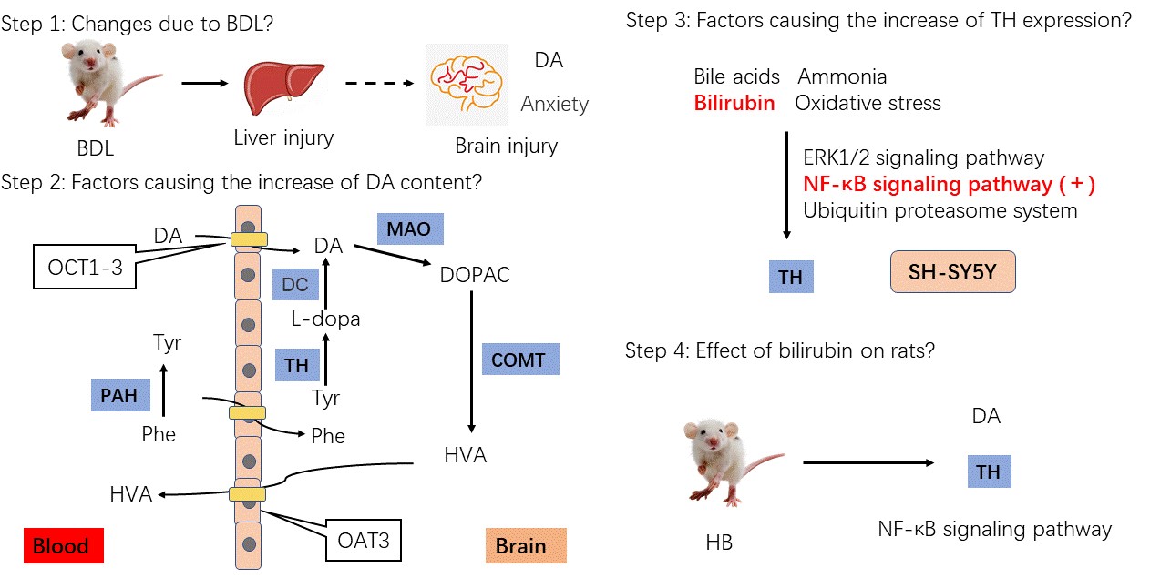 肝性脑病是肝衰竭的严重并发症,大脑中多巴胺水平升高是其典型症状之一。团队利用胆管结扎(BDL)大鼠研究多巴胺水平增加和精神异常之间的关系,并研究了肝衰竭增加脑内多巴胺水平的可能机制。研究结果发现BDL大鼠表现出类似焦虑的行为,同时多巴胺水平和皮层酪氨酸羟化酶蛋白表达增加。进一步的研究发现胆红素水平升高是诱导酪氨酸羟化酶表达的重要因素,NF-κB通路参与胆红素水平诱导酪氨酸羟化酶表达的作用,在高胆红素血症大鼠中也表现出与BDL大鼠中相同的焦虑样行为、多巴胺水平和酪氨酸羟化酶蛋白表达显著增加。综上所述,BDL显著增加大鼠皮层多巴胺水平,胆红素通过NF-κB通路诱导酪氨酸羟化酶功能和表达增加是BDL状态下脑内多巴胺水平升高的主要原因之一。