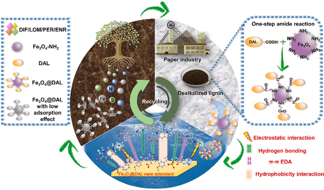 抗生素在畜牧业和农业中的使用导致水体中抗生素的过度排放,长期可能导致耐药并对生态产生影响。研究团队开发了一种绿色环保型吸附材料:脱碱木质素接枝磁性纳米粒(Fe3O4@DAL),用于环境水体中氟喹诺酮类抗生素的去除。Fe3O4@DAL将磁性纳米粒子的高效分离性能与可再生木质素活性官能团丰富的结构特点相结合,具有催化过硫酸盐对氟喹诺酮类抗生素进行氧化降解的能力。回收后的吸附剂仍可作为肥料缓释剂二次利用。相关工作以“Designing Degradable Lignin-grafted Magnetic Nano-composite Materials for Cost-effectively Sustainable Removal of Fluoroquinolone Antibiotics from Environmental Water”为题发表于Journal of Cleaner Production。公司2020级硕士研究生侯思妤为本文第一作者,纪顺利副教授为本文的通讯作者,太阳集团tyc151为本文的第一通讯单位。