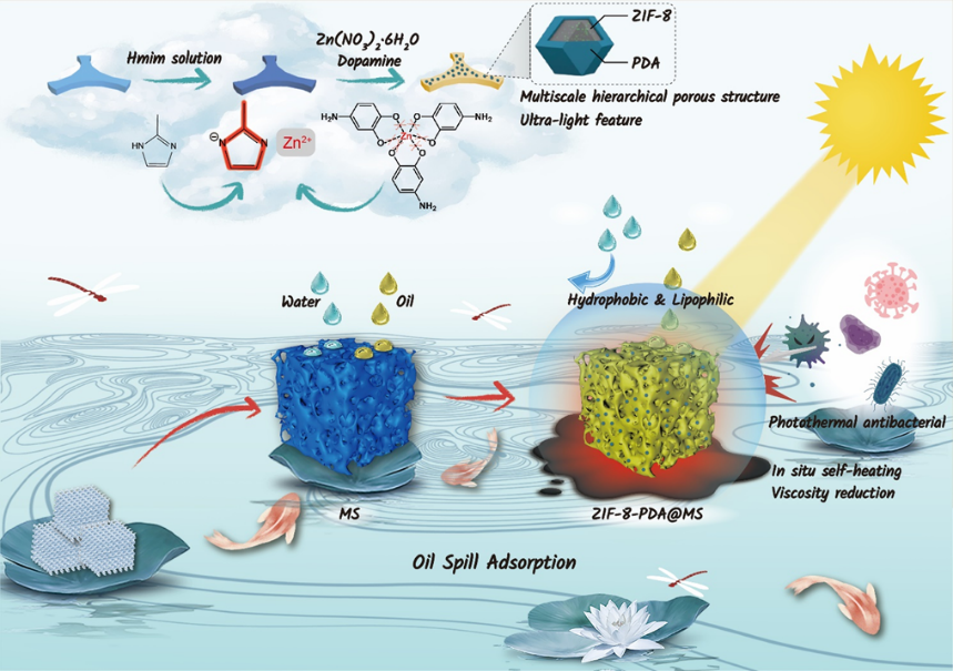 工业生产和日常生活中有毒试剂和含油废水的非法排放,以及频发的海上石油泄漏事故严重破环了生态环境。受“贻贝黏附”和“莲叶效应”的启发,研究团队利用聚多巴胺的生物黏附性和还原性,通过配体交换作用将具有大比表面积和高孔隙率的MOF材料(Ag NPs负载)修饰在三聚氰胺海绵(MS)的三维多孔骨架上,制备了一种具有超疏水/超亲油特性的功能复合材料--ZIF-8-PDA-Ag@MS。其具有微/纳米粗糙表面和多尺度分层多孔结构,及良好的阻燃性,能实现水中溢油和有机试剂的选择性高效吸附。此外,还具有光热联合抗菌和光热降粘协同作用,解决了高粘度原油因流动性差所导致的溢油回收难题。相关工作以“A Green and Facile One-Step Hydration Method Based on ZIF-8-PDA to PrepareMelamine Composite Sponges with Excellent Hydrophobicity for Oil-Water Separation”为题发表于Journal of Hazardous Materials上。公司2020级硕士研究生张钰琪为本文第一作者,柳文媛教授、纪顺利副教授为本文共同通讯作者,太阳集团tyc151为本文第一通讯单位。