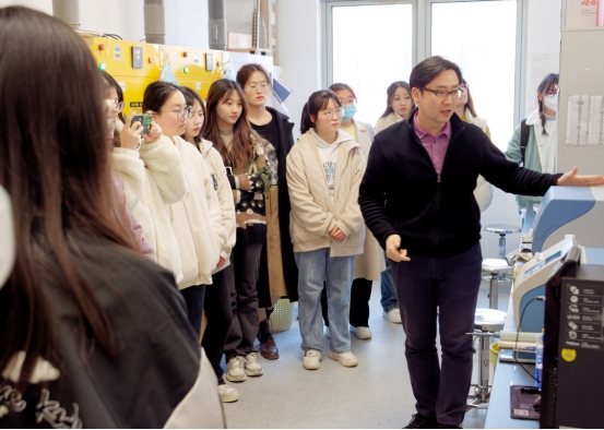 青年成长导师姜虎林老师带领同学们参观了药物制剂专业课题组实验室,展示了公司员工的精神风貌、扎实基础,通过亲身经历分享,为同学们织就了钻研有志、思辨求实的发展蓝图。