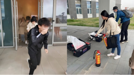 讲座结束后,现场所有人员在公司实验楼进行了消防疏散演练。师生们捂住口鼻,弓身弯腰,保持着安全距离,沿着指定路线快速、有序地从公司实验楼撤离。整个疏散过程,未出现拥挤推搡现象,做到了井然有序。