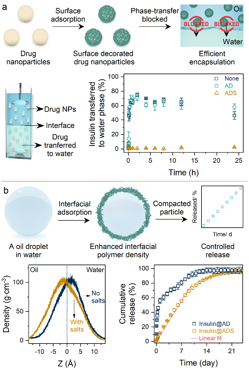 刘东飞教授团队将结构及性质多样的药物分子转换为胶体颗粒作为包载的基本单元,通过提高聚合物载体材料在药物胶体颗粒表面和油水界面的分布,制备具有功能基元序构特点的微球,实现多肽蛋白类药物的高效包载和可控释放。聚合物载体材料在药物胶体颗粒表面的吸附,有效突破两者相容性瓶颈,阻断药物从油相到水相的转移,实现高达99.9%的超高包封效率。通过水相中盐的引入,增强聚合物载体材料在油水界面的分布,在微球表面形成致密聚合物层,实现药物接近零级的释放动力学。结合分子动力学模拟等手段,本研究初步探究了聚合物分子界面分布对药物包封、微球结构与尺寸、药物释放的调控机制。利用自主开发的连续流装置(专利号CN202111465267)实现对微球制备过程的精准控制,有效降低所制备微球的批次间差异。本研究进一步完善了基于连续流的高性能载药微球制备平台的核心技术体系。