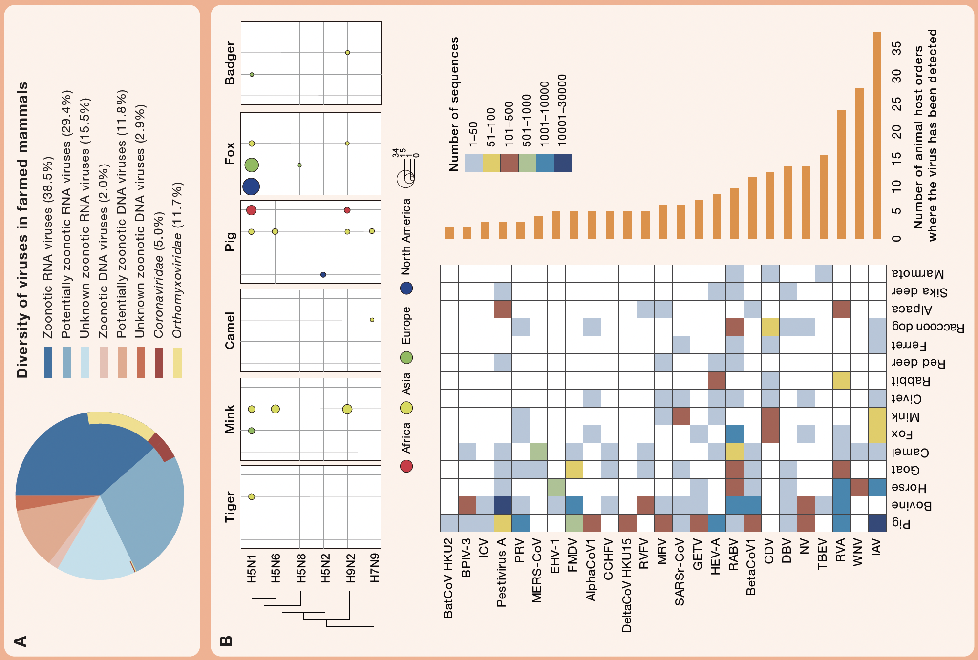众所周知,很多人类新发传染病来源于野生/养殖动物,研究团队对NCBI上的全部病毒序列展开分析统计,发现存在超过299,000条与养殖哺乳动物相关的病毒序列,RNA病毒序列占比83.4%,已知的人畜共患RNA病毒序列占比38.5%,来自正粘病毒科的序列占比11.7%。