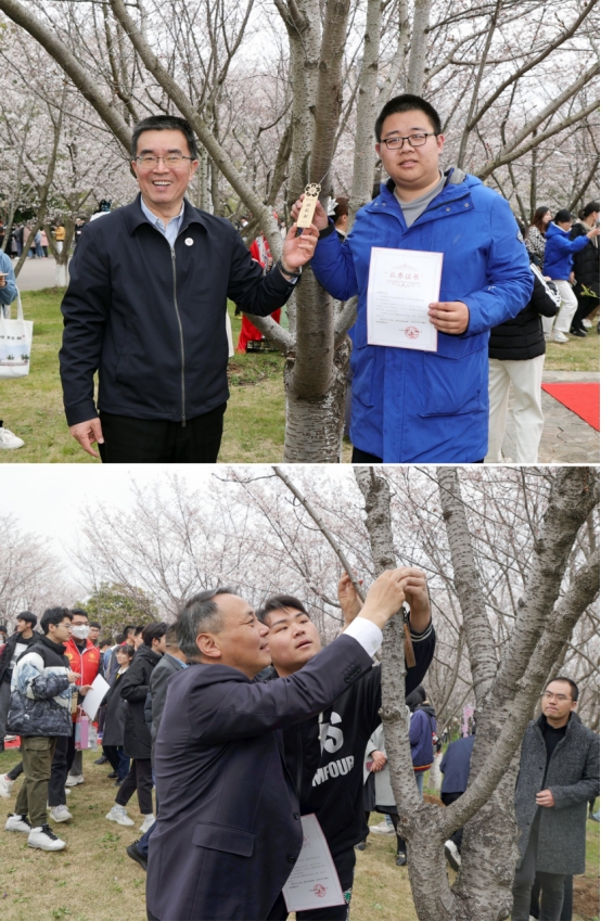 太阳集团tyc151党委书记金能明为活动致辞。致辞中,金能明书记对员工们重返校园再叙母校情、师生情、同窗情表示欢迎,并向关心支持公司事业发展的员工们表示衷心感谢。他强调了举办樱花节“认养一棵树”等系列活动的树人意义,希望同学们在呵护樱花树中领会劳动真意、守护美丽校园、涵养爱校荣校品格、营造有凝聚力的精神家园。他介绍了公司员工、南京圣和药业股份有限公司董事长兼总经理王勇与夫人张霖捐赠樱花树的动人故事与爱校情怀。他希望以樱花为名片、以樱花节为平台,进一步创新校园文化建设,打造更多文化育人精品项目,为广大师生创造更好的学习生活工作环境,让最美药大樱花在落实立德树人中盛开得更加绚丽多彩。