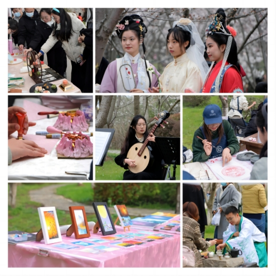 游园会上,公司各社团精心准备展演与活动。沐韵流音古风社汉服走秀罗衣轻裾、拂袖翩翩,一眼千年,穿越古今风华,显国风之雅、国风之韵、国风之美;雕版印刷艺术工作坊研学传统制法,显露非遗技艺,展现方寸之间的工匠精神与艺术创作的凌云逸气;子归书画社于翰墨神韵中寻书法逸兴,于妙笔丹青中品绘画雅致,于金石章印中探篆刻精妙;民乐团笙箫齐鸣、藥樂同音,古曲悠悠响彻樱林,历史长河映入双耳;清新茶社一捧春水煎茶,以茶载道,以茶会友,慢品人间春色;RH舞蹈联盟如初春朝日,舞出百卉萌动、意气风发少年姿;菁菁音社浅吟清唱,歌声中有暗香浮动、红尘万丈,唱出药世风华;彩梦俱乐部,执笔绘春日美好,将浪漫留在画卷上;冬虫夏草协会,科普植物知识,讲解樱花药用价值。赏花灯、寻福袋、写祝福,持矢投壶、行飞花令、解谜答题,师生畅享游园之乐,体味中华传统文化雅韵,感受药大校园蓬勃气象。