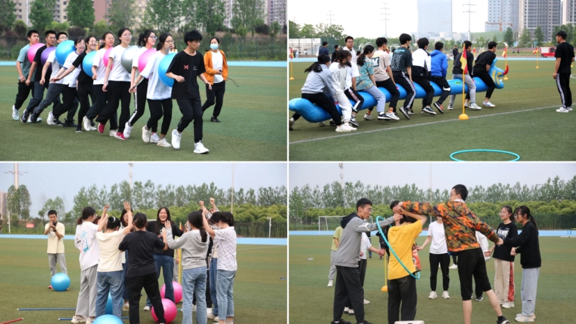 各队伍在体育场上燃情拼搏,呈现出一场精彩的趣味运动赛事。比赛项目包括“坐地起身”“一传到底”“不倒森林”“旱地龙舟”“前呼后应”“激情节拍”,用时短者获胜。“坐地起身”,同学们互挽着手臂在草坪上相互支撑,从坐着慢慢站起;“一传到底”,同学们手拉着手,呼啦圈在飞舞着、旋转着;“不倒森林”要求维持牵引棍的直立,锻炼了同学们的平衡稳定性;“旱地龙舟”考验了团队协作能力,同学们一边奔跑,一边齐喊口号;“前呼后应”充分表现出同学们的协调性,同学们相互配合,互为依托,迈向终点;最后是“激情节拍”,大家齐声高喊“我们是最棒的!”。赛场之上气氛热烈、妙趣横生,时而欢声雷动,时而惊呼嗟叹,但始终是欢笑连连、掌声不断。