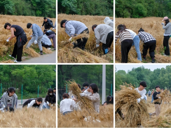 全体师生党员怀着激动的心情走入田间,弯腰、左手握小麦、右手挥镰刀,快速收割、捡拾小麦、打结捆扎,不喊累、不叫苦,分工明确、干劲十足,在麦田中体会劳作的愉悦与丰收的喜悦,培养热爱劳动的品质,增进知农爱农的情感。