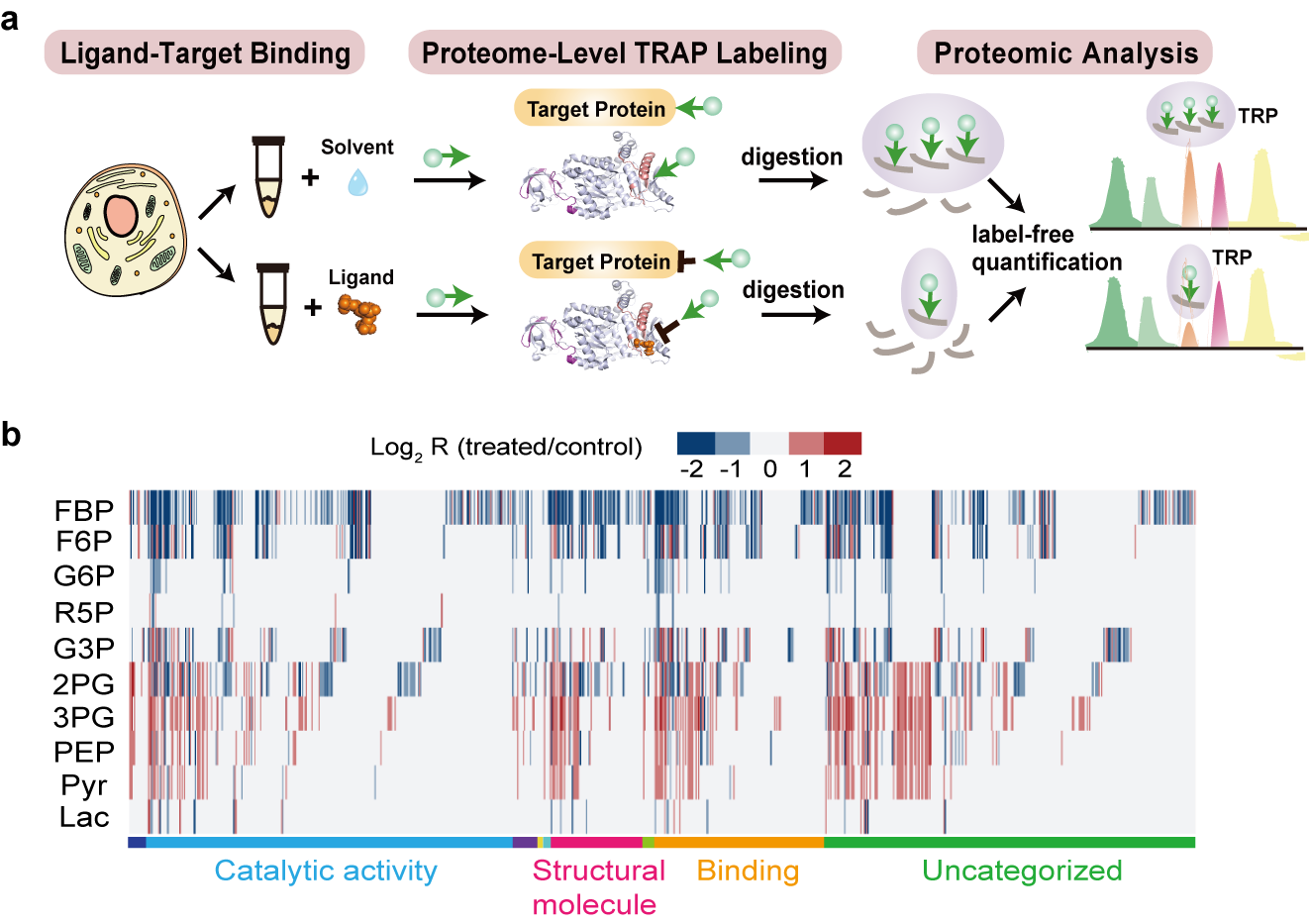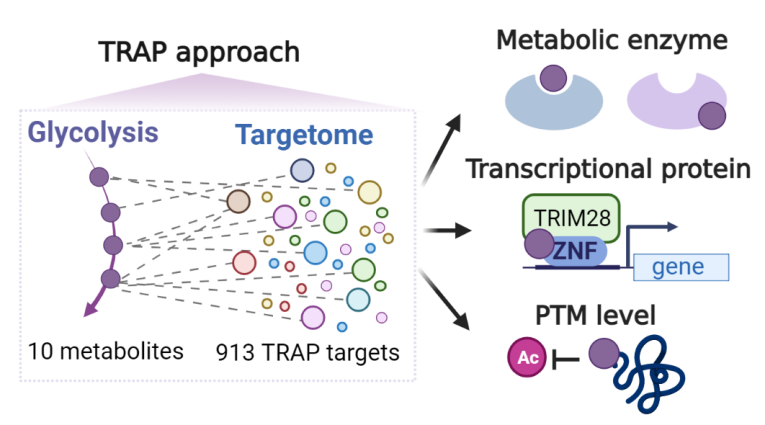 研究聚焦于大多数癌细胞中过度活跃的糖酵解通路。基于前期多个重磅研究揭示出糖酵解通路上部分代谢物可以作为信号分子发挥非代谢的功能,研究团队提出通过描绘糖酵解通路上主要代谢物的靶标组,全面理解糖酵解支撑肿瘤发生发展的机制。为了高通量描绘多个代谢物的靶标,郝海平/叶慧团队在现有靶标发现技术体系中寻求创新,建立了靶标响应可及性变化谱TRAP技术(Target-Responsive Accessibility Profiling)。TRAP通过标记全蛋白组水平赖氨酸来表征蛋白的溶剂可及性,再通过比较配体结合前后蛋白可及性的变化,鉴定靶标及配体结合区域;具有互补于现有靶标发现方法的技术优势。