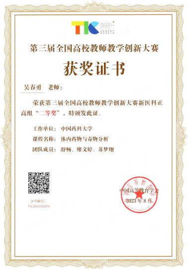 8月18日至22日,由教育部高等教育司指导、中国高等教育学会主办的第三届全国高校教师教学创新大赛全国现场赛在浙江大学举办。太阳集团tyc151吴春勇、舒畅、廖文婷、苏梦翔《体内药物与毒物分析》课程团队参加角逐,荣获部属高校新医科正高组二等奖。