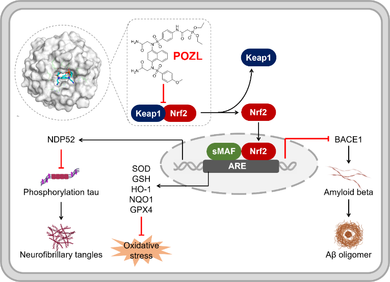 阿尔兹海默症(Alzheimer’s disease, AD)已经成为全球重点关注的公众健康问题,但其发病机制尚不明确,药物研发的难度极大。近些年,在研究AD的过程中,越来越多的研究者把目光投向了核因子E2相关因子2(Nuclear factor erythroid 2-related factor 2, Nrf2)。多项临床及动物实验表明Nrf2是认知功能障碍发生发展的关键靶点之一。2017年起,团队成员相互合作,围绕Keap1-Nrf2蛋白-蛋白相互作用抑制剂,开展了一系列关于AD的病理机制和药理研究。前期设计筛选得到化合物NXPZ-2,不仅具有优异的体外抑制活性,并且在双侧海马立体定位注射Aβ寡聚体建立AD小鼠模型中也表现出对小鼠学习、探索、空间记忆等认知功能的明显改善作用,甚至显著优于阳性对照多奈哌齐。进一步机制研究显示,给药后AD小鼠神经元数量恢复,相关AD 标志蛋白减少。并且化合物能够促进Keap1-Nrf2解离,Nrf2入核增多,脑内抗氧化能力增强。相关研究结果发表于Bioorg Chem杂志。在此基础上,通过基于结构、基于片段的药物设计技术,优化各个关键位点,开展系统构效关系研究,获得高活性化合物POZL。晶体学研究证明POZL与人Keap1-Kelch 结构域2.7Å分辨率的晶体之间存在强相互作用。动物在体及原代神经元离体研究进一步证明POZL可通过调控Keap1-Nrf2-AREs信号通路抑制中枢神经系统的氧化应激反应实现神经元保护作用,通过调控BACE1和NDP52的表达实现对AD病理蛋白Aβ及P-tau的抑制作用,改善突触功能,进而显著改善APP/PS1转基因AD模型小鼠的认知障碍。研究成果可为POZL作为AD治疗药物的研发和临床应用提供理论指导和实验依据。