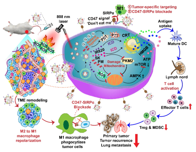 阻断CD47-SIRP𝛼轴和重塑TAMs为抗肿瘤表型是两种增强肿瘤免疫治疗的有效手段。课题组构建了一种来源于M1型TAMs细胞外囊泡、RS17肽(一种与肿瘤细胞上CD47特异性结合并阻断CD47-SIRPα信号传导的抗肿瘤肽)修饰的杂化纳米递药载体(hEL-RS17),该载体可主动靶向肿瘤细胞并重塑TAMs表型。采用hEL-RS17递送化疗药、光敏剂、免疫佐剂(SPI@hEL-RS17),此纳米递送平台凭借着各组分的密切协同,联合多种治疗模式,展现出了增强的抗肿瘤效果。在激光照射下,SPI@hEL-RS17纳米颗粒对4T1乳腺肿瘤和B16F10黑色素瘤均表现出强大的疗效,不仅抑制了原发性肿瘤生长,而且还建立了长期免疫记忆,抑制了肿瘤的转移和复发。因此,该研究在基于CD47阻断的抗肿瘤免疫治疗方面展现出良好的应用潜力。