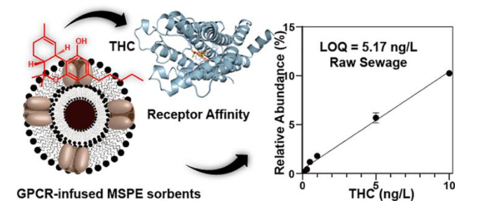 近年来,狄斌团队围绕环境样品中痕量精神活性物质的定量分析开展了大量研究工作。本研究在前期工作基础上,建立了一种全新的策略,利用GPCR受体包被技术将传统磁富集的物理吸附升级为高特异性的生物识别,从而大大提高了前处理方法效能以及后续液质分析的灵敏度。课题组提出了受体亲和性磁固相萃取技术,采用包被高表达GPCR细胞膜的磁性脂质体作为吸附剂,制备修饰有CB1大麻素受体的新型吸附剂CM@Lip@Fe,实现复杂污水基质中特异性提取和富集THC的目的。基于CM@Lip@Fe配体-受体相互作用的高亲和力和分子选择性,其与HPLC-MS/MS联用在未经处理的污水中取得了5.17ng/L的定量限。方法优势包括无需有机溶剂,灵敏度较传统液液萃取提高了5倍,吸附剂用量低(75mg/L污水)和高效性。