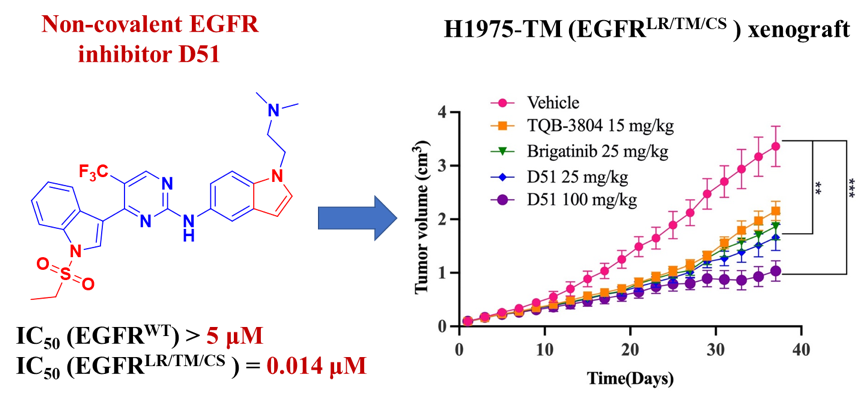 肺癌是世界范围内最常发的癌症,其中非小细胞肺癌(NSCLC)占80%以上。在NSCLC患者中EGFR突变率高达50%,因此EGFR是NSCLC的重要治疗靶点。然而,EGFR获得性耐药突变使NSCLC的治疗面临巨大挑战。截止到目前,还没有抑制剂被批准用于治疗Osimertinib耐药的EGFRC797S突变。为了克服EGFRC797S耐药突变,课题组以Osimertinib为先导化合物,采用环化策略设计合成了一系列化合物。通过体外酶活和抗细胞增殖活性筛选得到候选化合物D51,D51能够显著抑制细胞增殖与EGFR下游信号传导,诱导细胞凋亡。动物实验表明,D51具有极高的安全性和良好的药代动力学性质,并且D51能有效抑制异种移植肿瘤的生长,其药效优于TQB-3804和Brigatinib。本研究提供了一种具有不同化学骨架的强效选择性EGFR抑制剂,为治疗 Osimertinib 耐药NSCLC提供了新的选择。