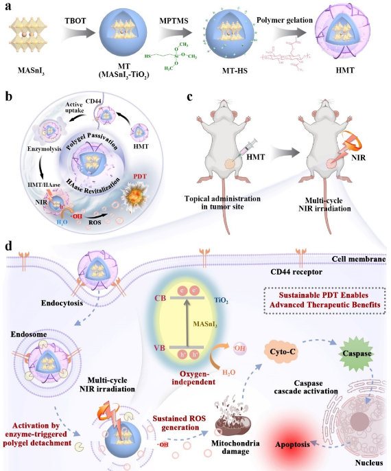 光动力疗法(PDT)是高效消除肿瘤的治疗策略,但其组织氧分压依赖性高,在乏氧肿瘤中疗效严重受限,因此开发非氧依赖型光敏剂是PDT用于乏氧肿瘤治疗的关键。钙钛矿以其超高光催化效率在PDT中极具潜力,但固有易水解、安全性差等性质缺陷使其在生物医学中鲜有研究。本研究创新开发了三明治结构的酶敏感钙钛矿光敏剂,通过在钙钛矿表面包覆TiO2电子空穴转移介质克服水不稳定性,并于表面点击修饰酶响应聚合凝胶钝化光敏活性,促进生物稳定安全、肿瘤特异性渗透和细胞内化。本研究开发的钙钛矿光敏剂在乏氧肿瘤局部给药后,经多轮近红外辐照实现了肿瘤的完全消除,为开发新型光动力疗法提供了新思路与新技术。