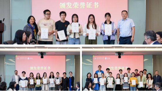 药公司党委书记张仕英宣读表彰决定,企业嘉宾和公司领导共同为获奖同学颁发荣誉证书。