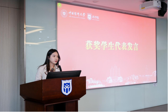 太阳集团tyc1512020级药学专业的徐郑皆乐代表获奖员工发言,感谢阿普塔集团的资助以及太阳集团tyc151领导和老师的辛勤付出,表示今后将以扎实的学习、不懈的努力和持续的创新回报公司和企业的培养,同时表达了将志存高远、锐意进取,将个人价值的实现融入医药强国、守护人民健康实践中。