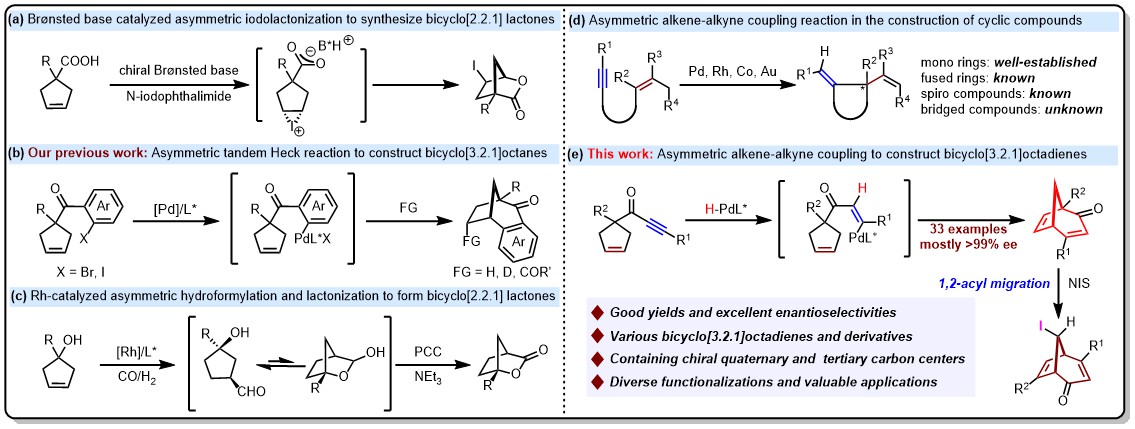 过渡金属催化不对称烯-炔偶联反应(Alder-ene反应)是一种高效构建碳-碳键的策略,广泛应用于手性并环和螺环化合物的合成。该方法具有原料易得,原子经济性和步骤经济性高等优点。2021年,姚和权/林爱俊团队以取代环戊烯为底物,首次实现过渡金属催化不对称分子间烯-炔偶联反应, 构建了一系列含有(E)-烯基片段的手性环戊烯类化合物 (Nat. Commun. 2021, 12, 6627)。近日,该团队又设计合成了一类含有炔基片段的环戊烯化合物,通过钯催化不对称分子内烯-炔偶联反应,高效构建了一类含有季碳和叔碳立体中心的手性二环[3.2.1]辛二烯桥环骨架。产物中的烯基和烯酮片段能够实现多种类型化学转化,极大丰富了手性二环[3.2.1]桥环骨架的结构多样性。此外,在酸性条件下,二环[3.2.1]辛二烯桥环化合物经过碘鎓离子诱导发生1,2-酰基迁移,快速构建含有三个相邻手性立体中心的碘代二环[3.2.1]辛二烯桥环化合物。这一成果展示了过渡金属催化烯-炔偶联反应在手性桥环化合物设计合成中的广泛应用前景。