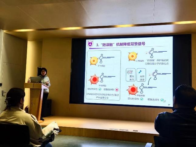 刘颖教授主要从以下四个方面展开:一是智能响应DNA纳米结构;二是智能响应DNA纳米结构用于原位测量;三是稀土纳米材料以及生物传感;四是跨细胞膜DNA逻辑运算等。最后,刘教授还基于如何申请国家自然科学基金,分享了宝贵经验。会后,围绕刘教授的研究课题和基金申请等方面,众多师生展开提问,刘颖教授逐一解答,现场气氛热烈。其中部分问答记录如下: