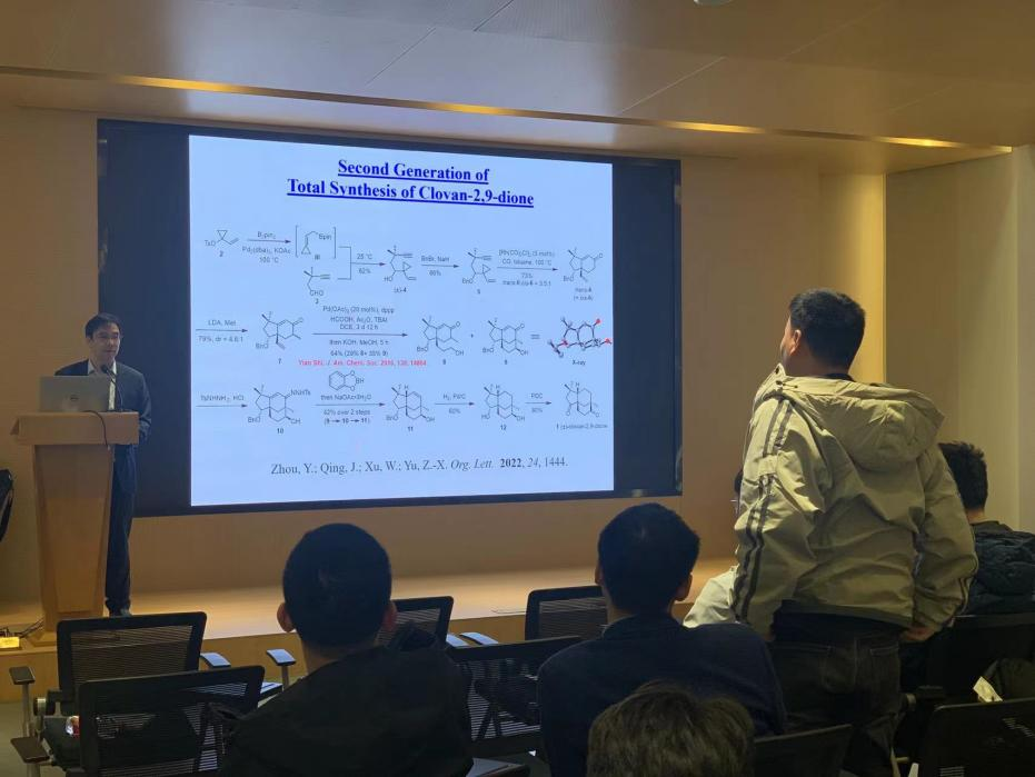 报告中,余志祥教授介绍了课题组发展的[5+2+1], [7+1], [4+2+1], [5+2], [4+3], [3+2+1], [4+2], [5+1], [3+2], [4+1]等一系列成环反应,并将其中的一些反应应用于天然产物的合成。利用计算化学为主要手段研究反应机理,然后基于机理设计新反应,并通过实验进行验证和发展。提问环节中,太阳集团tyc151杨鹏教授、林爱俊教授、高尚教授以及与会员工都与余教授进行了课题问题的探讨。余教授与在场师生积极互动,耐心细致地答疑,公司师生们均获益匪浅。
