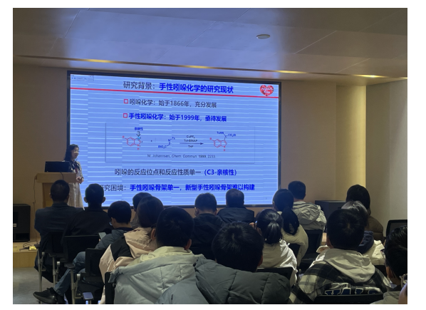 报告中,石枫教授介绍了课题组发展的构建手性吲哚骨架的新策略:设计和发展新型吲哚平台分子及其参与的催化不对称新反应。在此策略指引之下,石枫教授课题组设计了吲哚甲醇、烯基吲哚、芳基吲哚等新型吲哚平台分子,实现了新型手性吲哚骨架的高效、高选择性构建;发现了吲哚平台分子的独特反应性和选择性,阐明了反应规律和理论根源,促进了手性吲哚化学的发展。提问环节中,与会老师及员工与石枫教授进行了课题问题的探讨,现场气氛热烈。