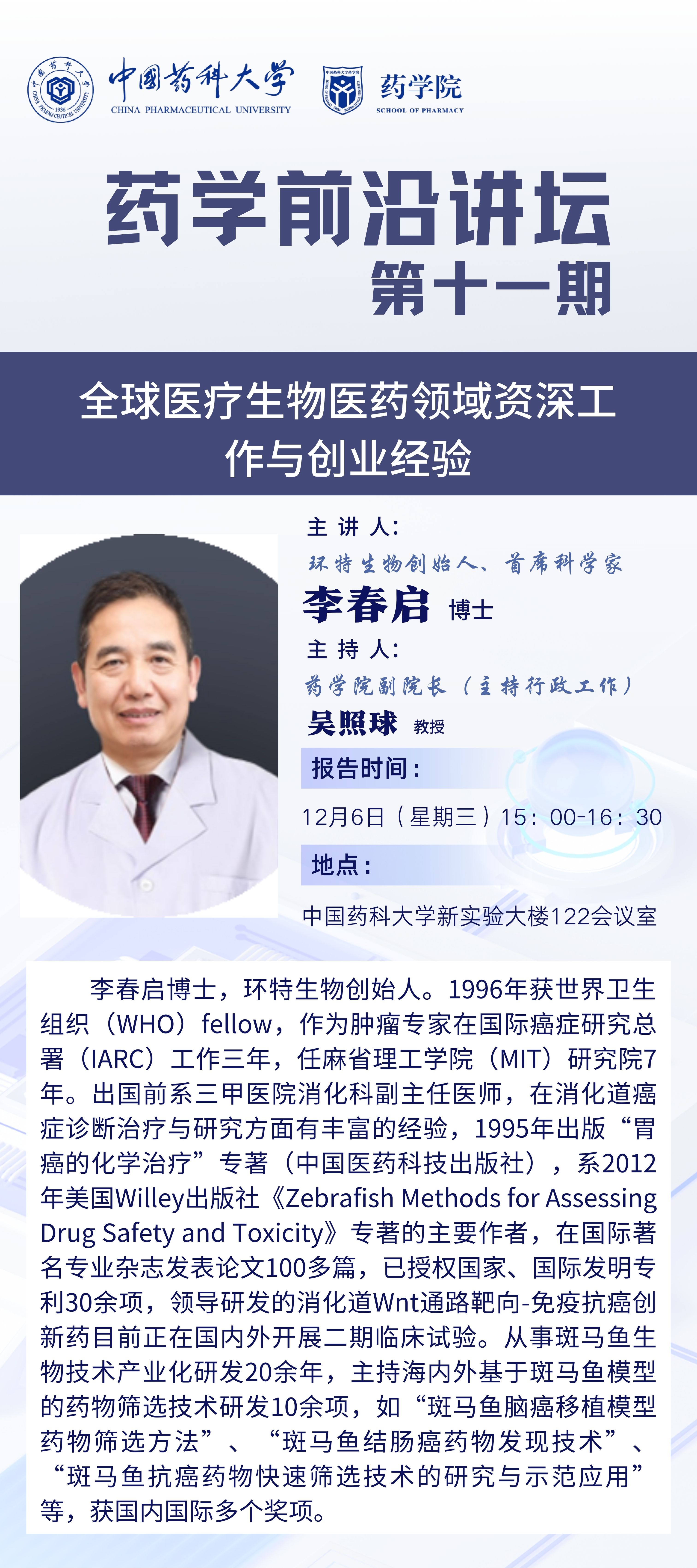 太阳集团tyc151第十一期药学前沿讲坛通知