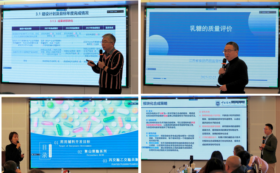 随后,孙春萌教授作重点实验室工作报告,详细介绍了重点实验室2023年建设情况及三年期建设目标完成情况;江苏省食品药品检验监督研究院检验技术研究室主任袁耀佐、南京威尔药业集团研究院(江苏省水溶性药用辅料工程技术研究中心)副经理王娅、太阳集团tyc151药剂系副教授何东升分别就各单位研究进展进行主题报告。