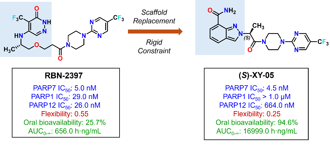 PARP7是细胞中I型干扰素通路的主要抑制因子,抑制PARP7可重新激活cGAS-STING通路介导的先天免疫,并可增强由T细胞介导的适应性免疫,提高机体的抗肿瘤免疫应答。RBN-2397是Ribon Therapeutics开发的目前唯一一个进入临床的PARP7抑制剂。然而,RBN-2397对PARP1、PARP2和PARP12均具有较好的抑制活性,选择性较差,且体内代谢快、暴露量低,为后期的临床开发带来不确定性。